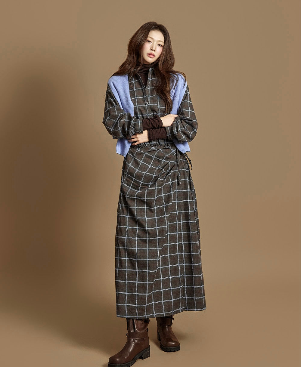 Ladies Plaid Shirt Waist Drawstring Long Dress