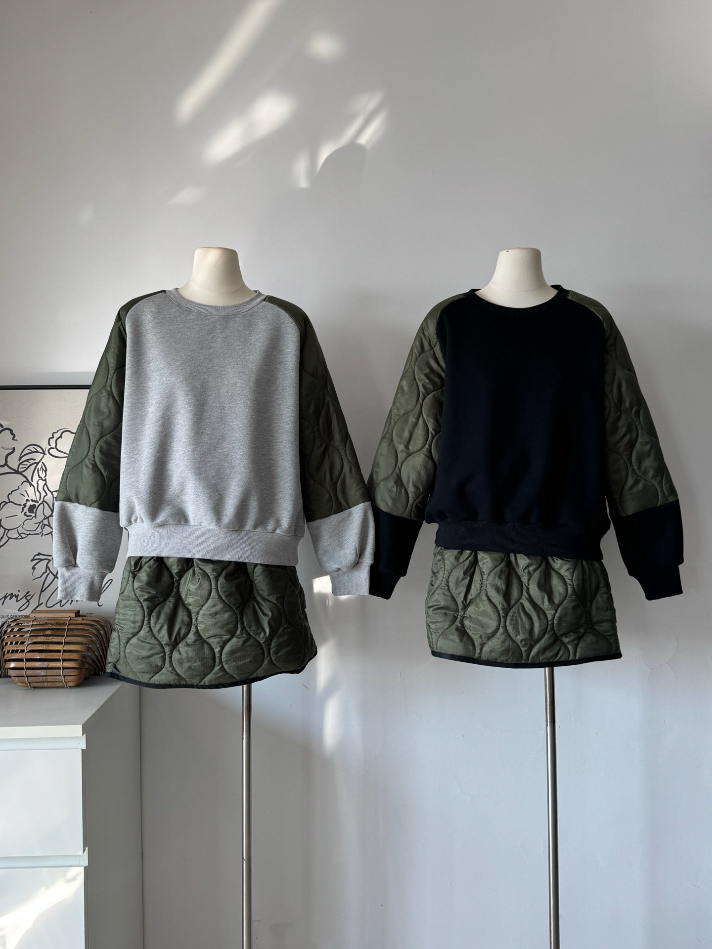 • Women's two-piece set (raglan sleeve sweatshirt + mini skirt) with a mix of soft fleece fabric and quilted panels