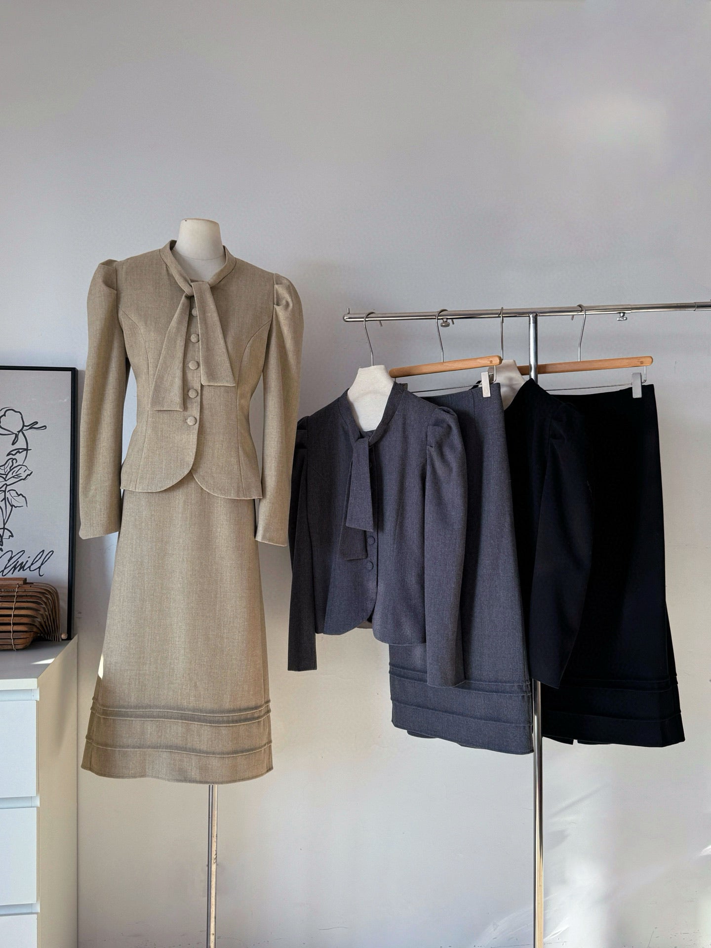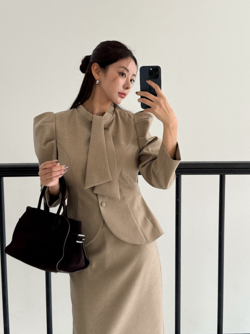 Ladies Vintage Puff Sleeve Peplum Jacket & Midi Skirt Set (Fixed Tie Collar)