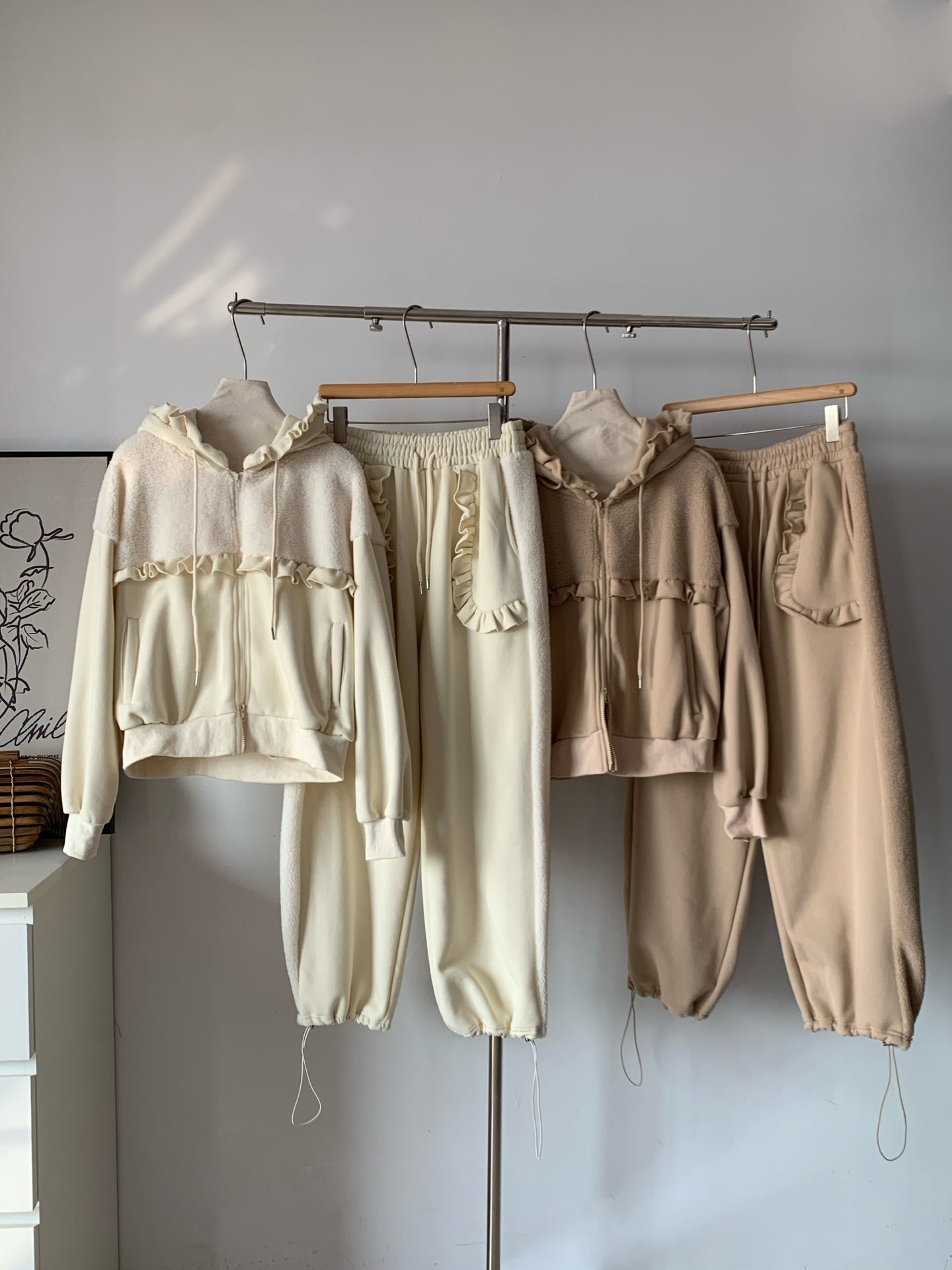 • Pants: Elasticated high waist + ruffled pocket detail + contrast sherpa trim on side seam + adjustable drawstring cuffs
